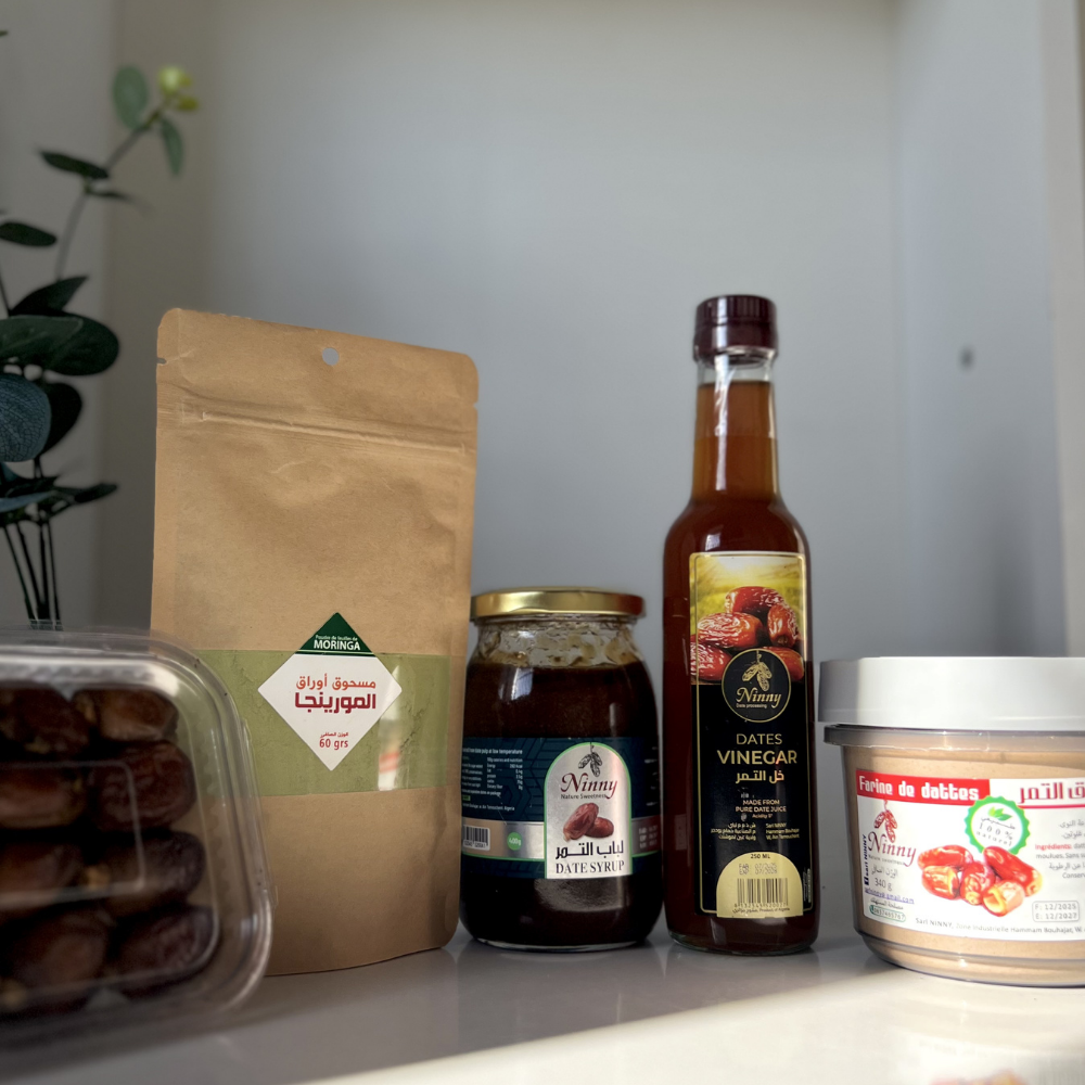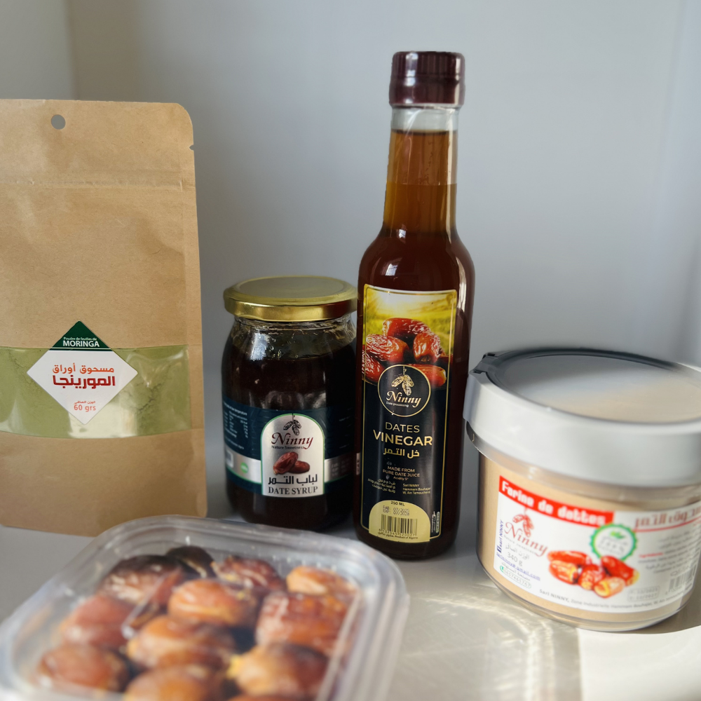 يوفر لباب التمر ومسحوق التمر مصدر طاقة طبيعي ويمكن استعمالهما كمحلٍ صحي في مختلف الوصفات، بينما يساعد خل التمر على تحسين الهضم ودعم نمط غذائي متوازن. أما أوراق المورينجا فتضيف لمسة غذائية غنية بالعناصر الطبيعية، ويمكن استخدامها كمشروب عشبي يومي.